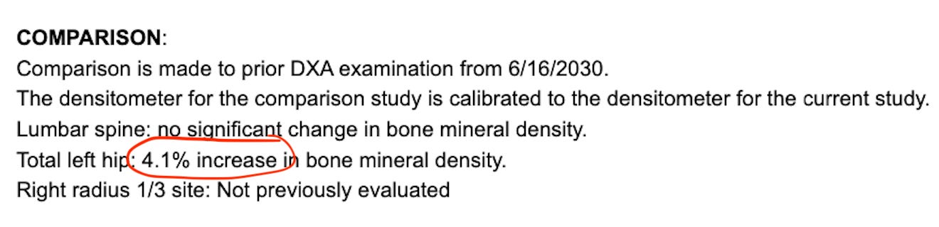 A year ago, I wrote a story about how lifting heavy weights with trainer Holly Rilinger, for just three months, boosted the bone density of my osteoporotic hip a full 4.1 percent. (Please ignore the typo below where it says the previous DEXA scan was in 2030. It was in 2023. I have not yet figured out how to time travel.)